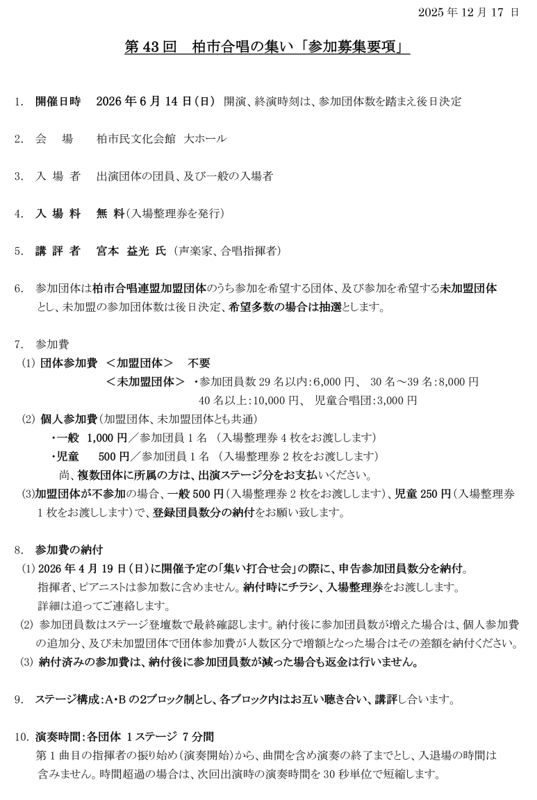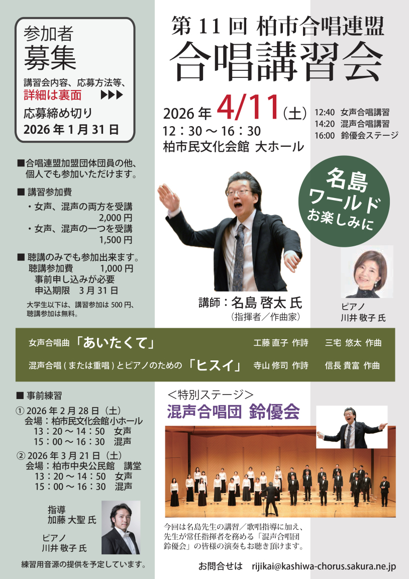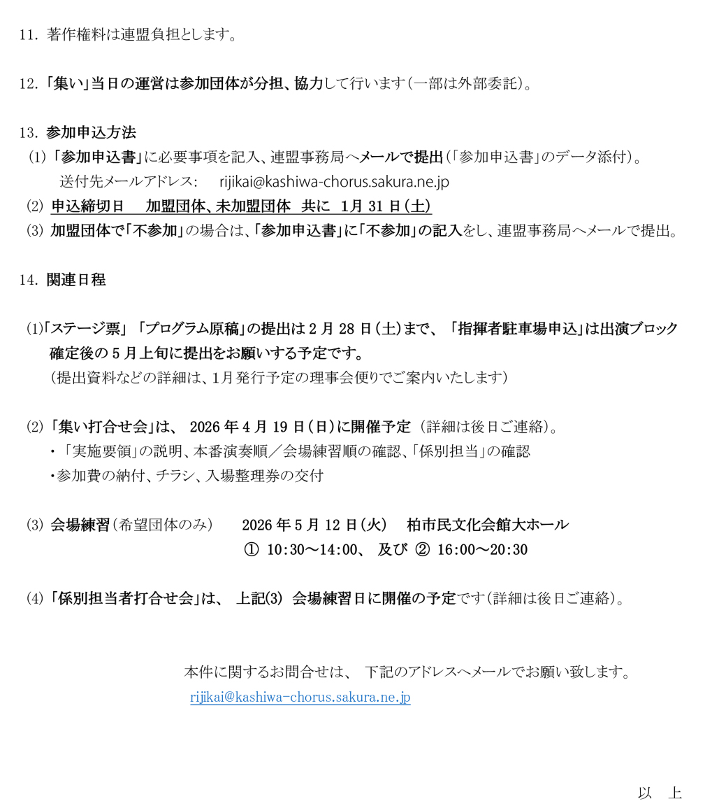 問合せ先: 柏市合唱連盟理事会 事務局 rijikai@kashiwa-chorus.sakura.ne.jp